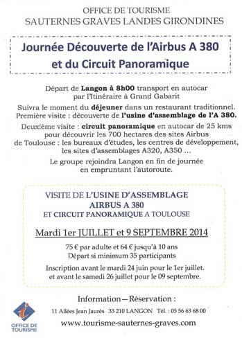 | Vous voulez en savoir encore plus ? Participez à la dernière journée découverte de l'Airbus A380 organisée par l'Office de Tourisme : Le 9 septembre 2014. Un clic pour lire l'annonce. | ||