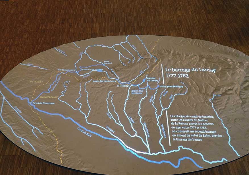 Le bassin du Lampy construit, entre 1777 et 1782, sur le lit du ruisseau du même nom possède une digue en granit de 137 m de long pour 16 m de hauteur, épaulée par 10 contreforts. Sa conception est directement liée au besoin d’eau supplémentaire provoqué par l’aménagement du canal de Jonction connectant le canal du Midi avec la Robine | |