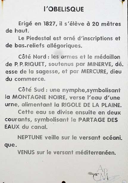 | Sur le site, une stèle a été érigée en 1837, par le Duc de Riquet de Caraman, gravée sur la pierre elle rappelle toute l’histoire de la construction du Canal. (Un clic dessus pour l'agrandir) | ![]() |
