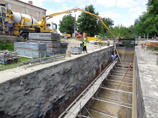 Des nouvelles des travaux... de l'écluse de Vialère, sur la Baïse. Le bas du bajoyer est en train d'être coulé. Le Conseil Général a décidé de remettre en place les trois derniers rangs avec les pierres de taille.