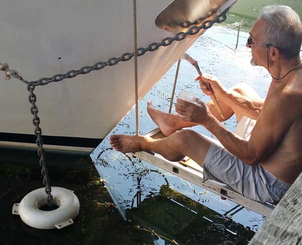Au port, les plaisanciers réalisant des retouches sur leur bateau, prennent toutes les précaution en matière de sécurité : Ici, Jean-Luc a sa bouée à coté de lui.
