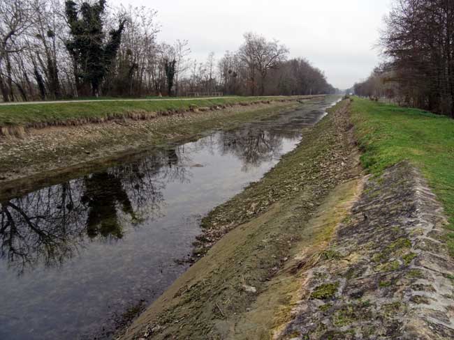 | Le bief de Bassanne est partiellement vide, suite à l'avarie sur le déversoir, voir ci-dessous. Allons faire un tour, voir le pont-canal d'Agen, en un clic ici. | ![]() |