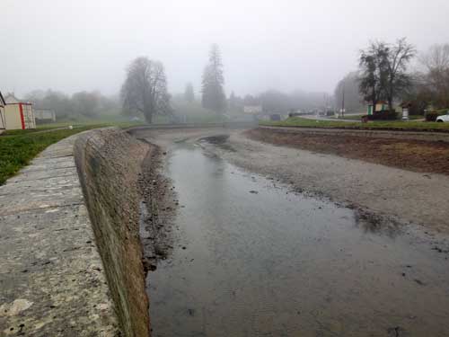 | Le bief du Petit Bezy est partiellement vide, en navigation, bien garder le milieu du chenal. | ![]() |