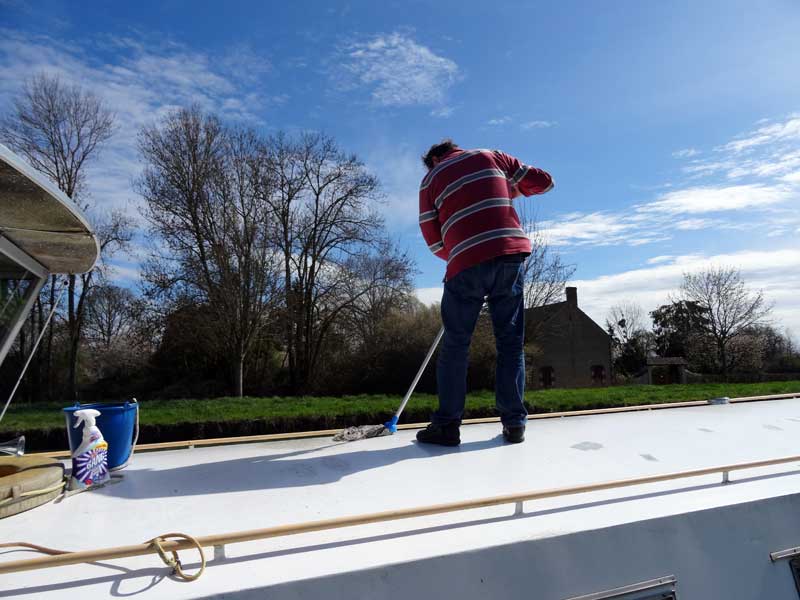 En attendant l'ouverture de l'écluse un peu de nettoyage permet de passer le temps, après attention au reflet du rouf en navigation. |