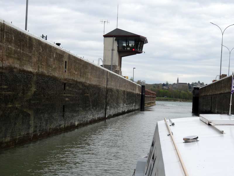 Première écluse de la journée, Pierre Bénite, avec une chute de 11.80 mètres, qui sera suivie de Vaugris de 6.70 mètres et pour finir Sablons avec ses 15.30 mètres, mais trop facile à passer avec leurs bollards flottants. |