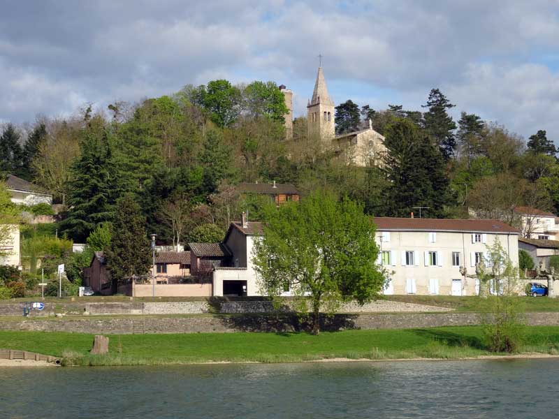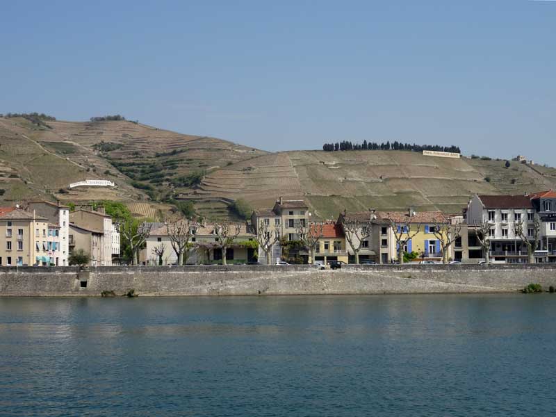 Notre guide nous indiquait un amarrage en rive gauche en amont du pont (sur Andancette), avec eau et électricité. Des promesses, des promesses... Mais la vue sur Andance nous ravit. Demain, impératif trouver de l'eau à mettre dans les cuves. |