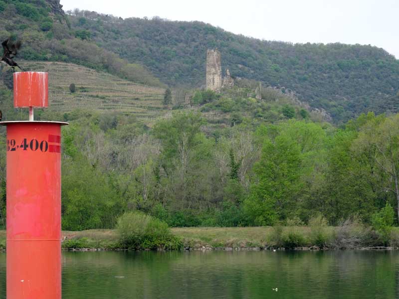Sur les rivières et les fleuves, il est prudent de naviguer en suivant les balises. (Petit rappel pour Marie-Claude, les rouges à droite, les vertes à gauche, mais cela en descente). Sur le Rhône, il y a en plus, des tours en ruine égrainant le parcours. |