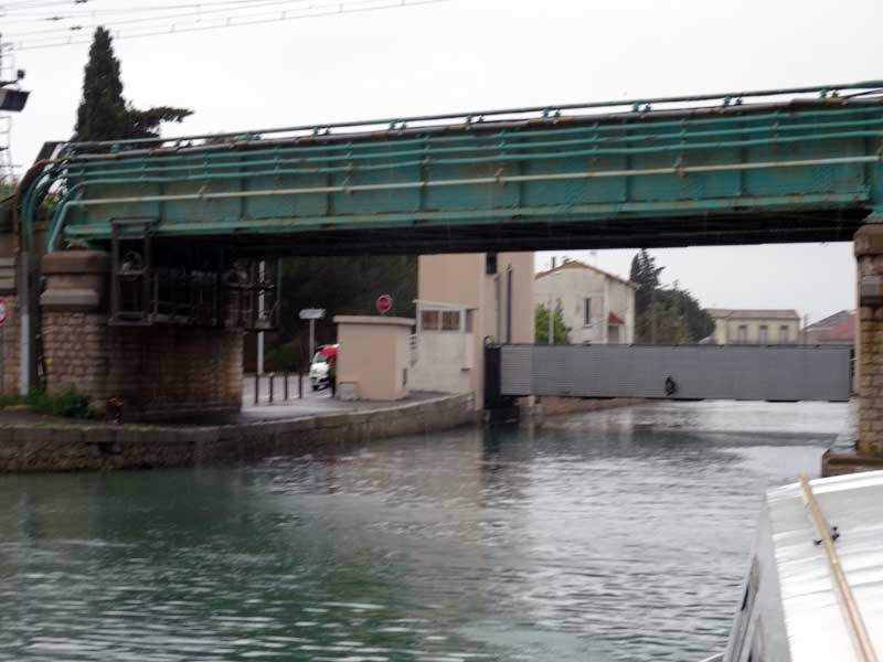 Nous avançons lentement vers le pont Saint Jean. Le pontier nous informe par les feux, que bientôt nous pourrons franchir le pont tournant de Moissac. |