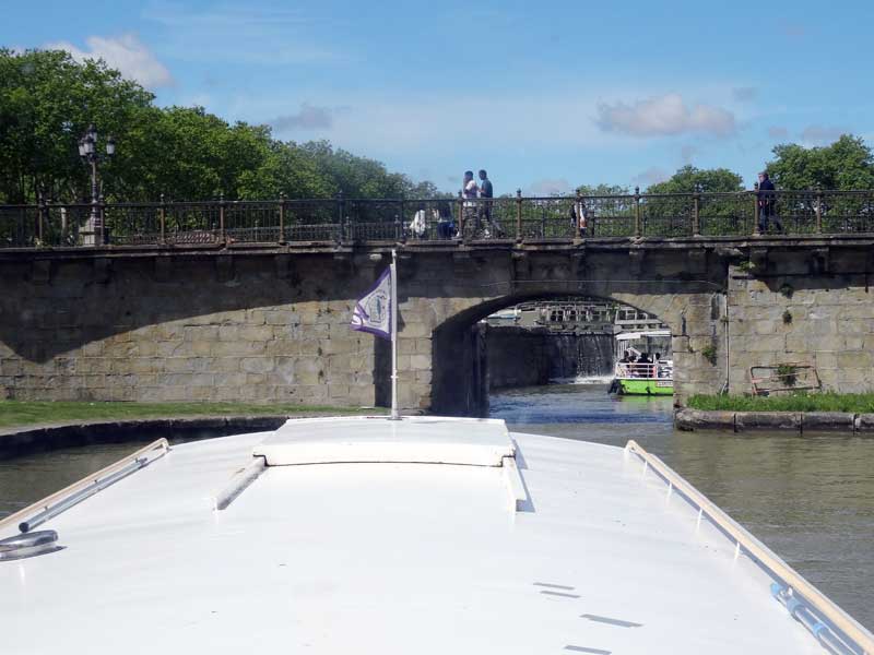 A dix neuf heure trente cinq, nous quittons les ponts Jumeaux et le port de l'embouchure pour nous éloigner du brouhaha de la circulation et venons nous blottir au-dessus de l'écluse de Lalande. |