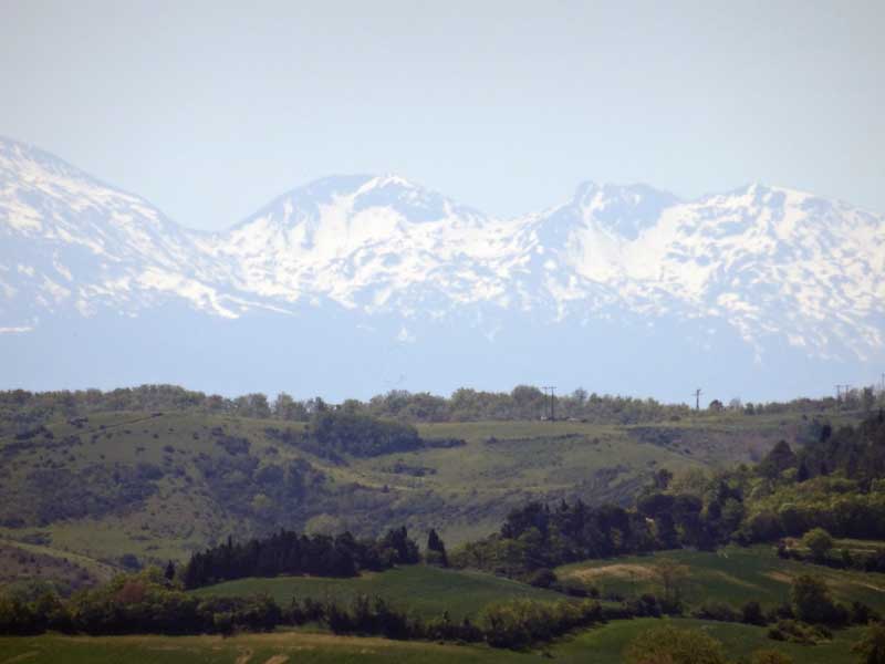 Depuis ce lieu, notre regard se porte vers la chaîne des Pyrénées et nous tentons de localiser le pic d'Aneto. Cela nous rappelle les bateaux de la socièté "Citerna" , qui portaient le nom des sommets des Pyrénées : Aneto, Vignemale, Maladeta, Cambalès, etc.. |