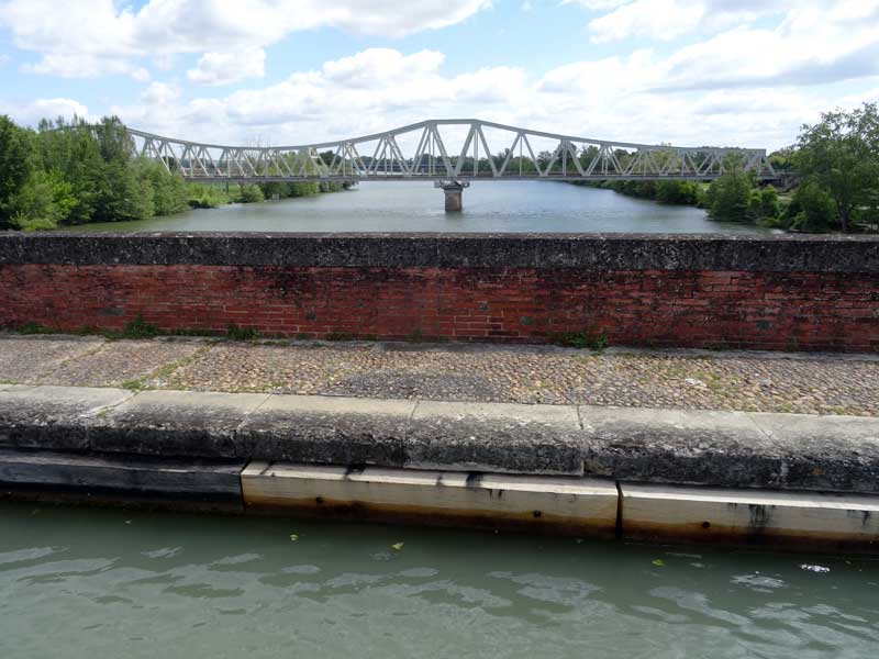 Nous voici au-dessus du Tarn, nous apercevons le pont du chemin de fer. Lors d'une crue, celui-ci fut emporté et le canal partagea son pont avec le train. |