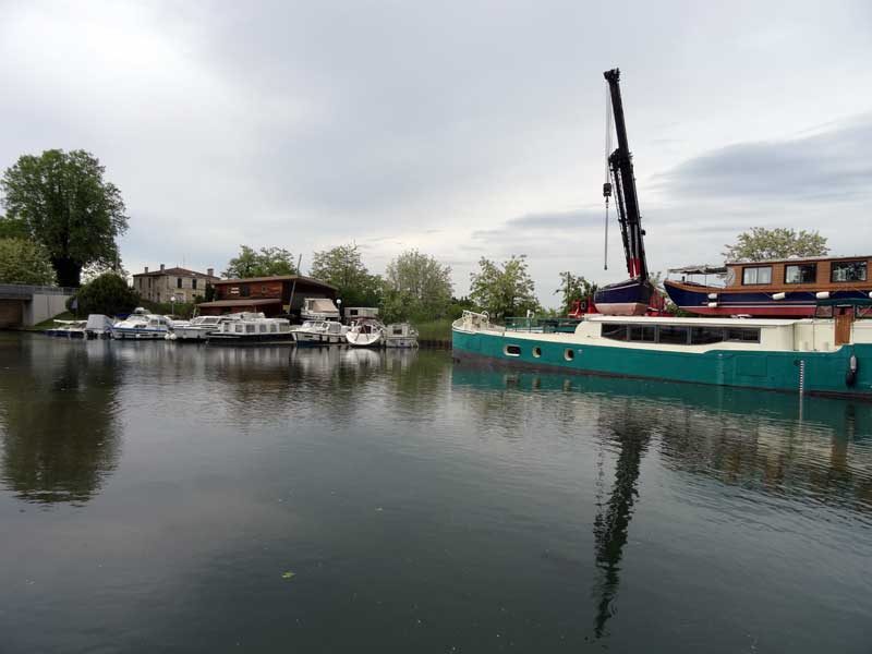 Entrée du port de Castelsarrasin, sur notre droite tout est "clean". Le chantier de Bernard a été déplacé. Cela surprend ! Le capitaine y avait rencontré Serge en plein travail. |