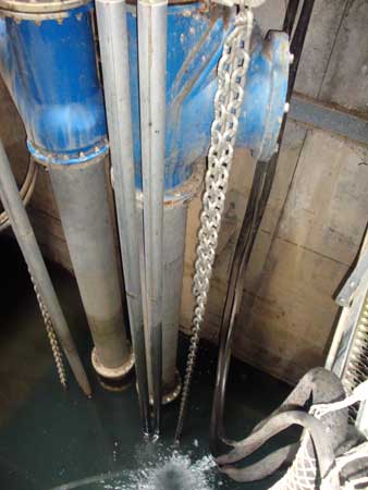 Grâce à un ingénieux système sur rail, les pompes viennent se mettre en place assurant l'étanchéité avec la tuyauterie. A ce moment là, le débit passe à 220 litres / seconde. |